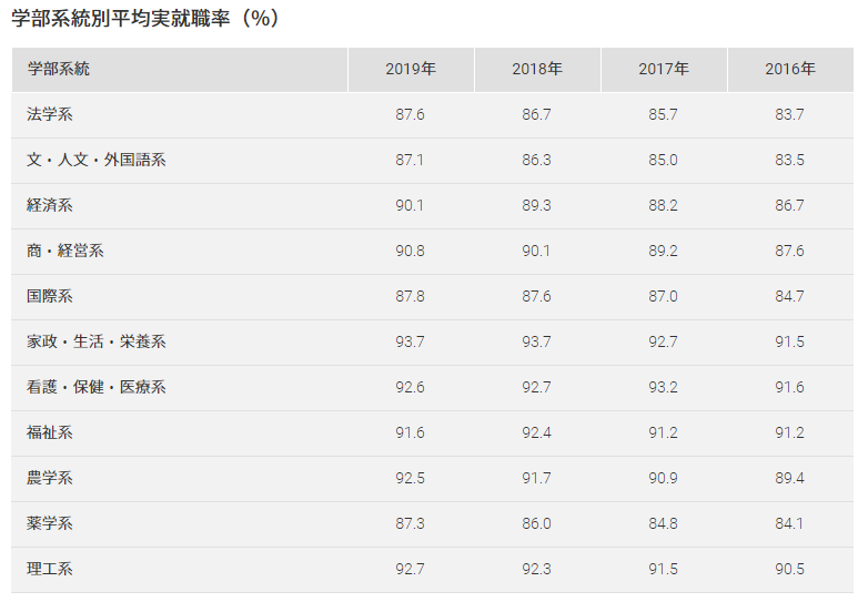 平均就业率最高的为「家政・生活・栄養系」,达到93.7%。最低的是「文・人文・外国語系」,就业率为87.1%。